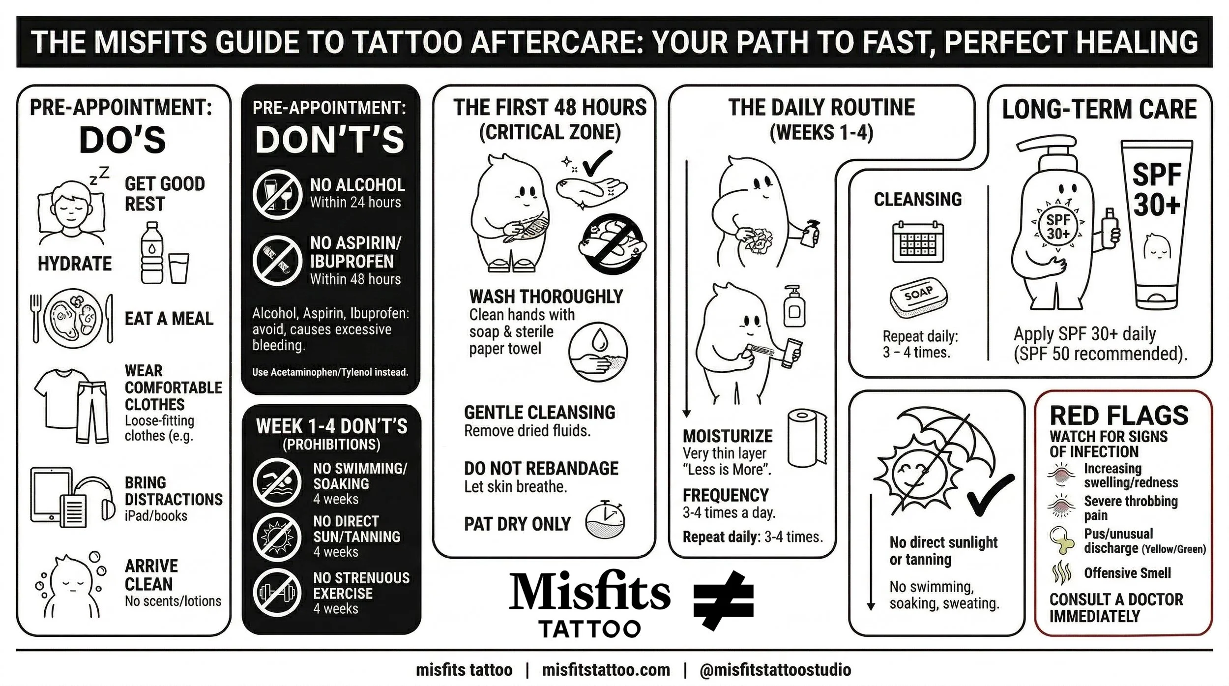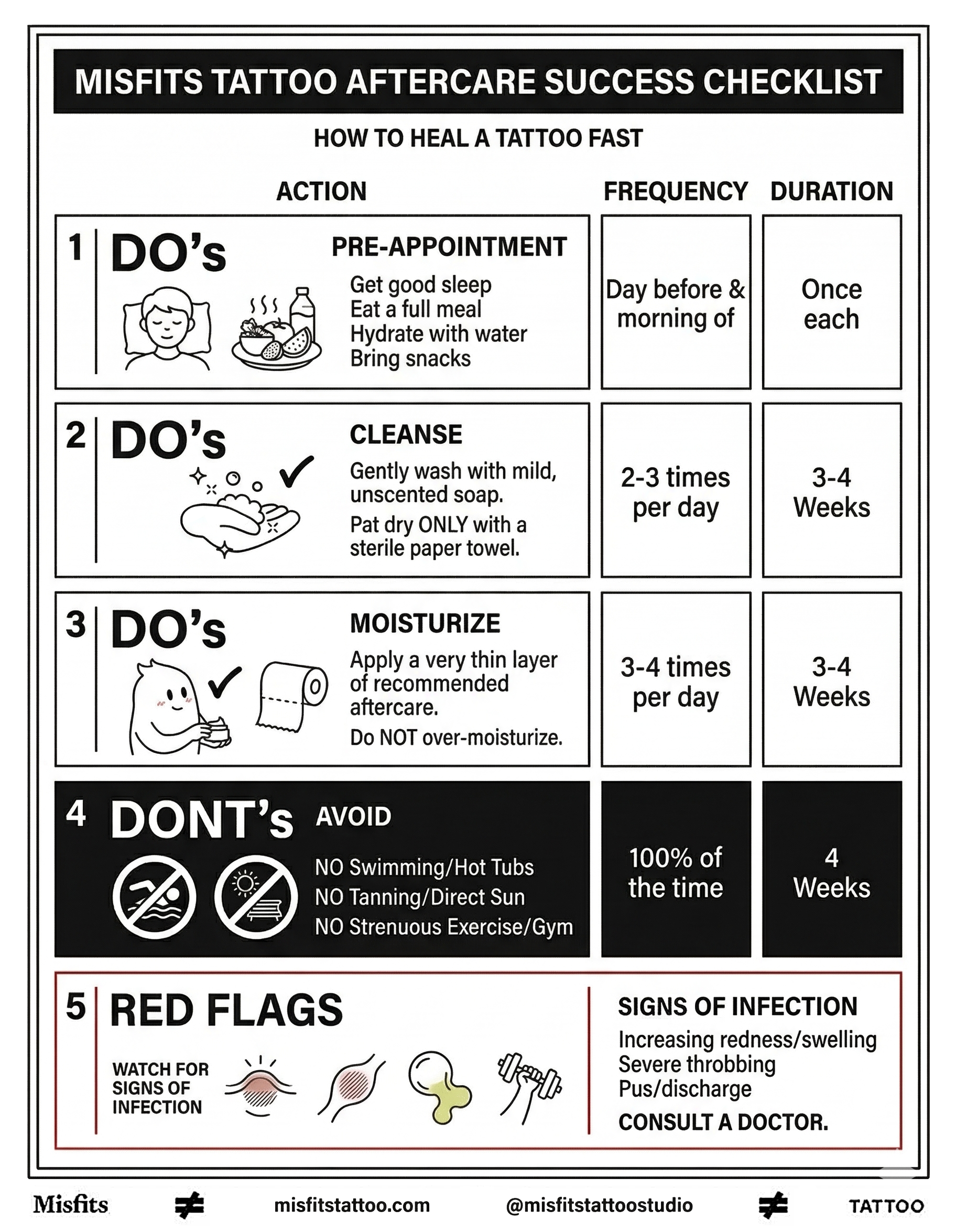 In this comprehensive Misfits Guide to Tattoo Aftercare, we’re breaking down the industry secrets on how to heal a tattoo fast while keeping those lines sharp and colors vibrant. From the crucial "Do’s" before you even step into the shop to a step-by-step breakdown of the first 30 days, consider this your ultimate authority on keeping your skin healthy and your art looking fresh.
